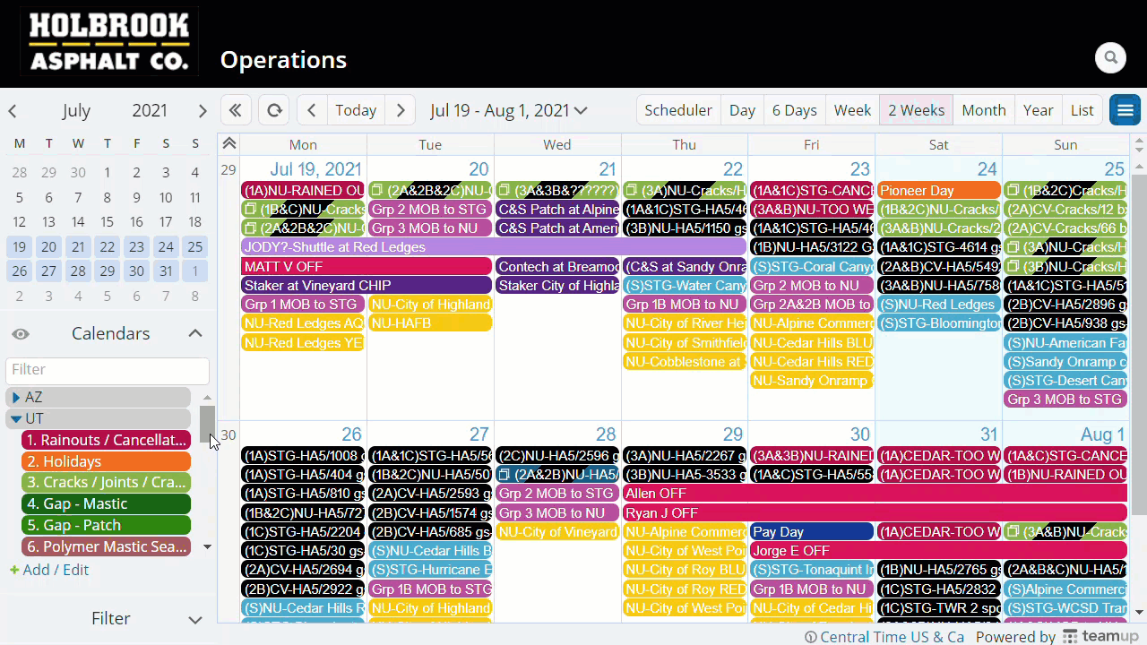 The varied permissions are still OUR biggest luxury with this calendar as well. We have so many varied positions and each one only needs a piece of the calendar to do their job. With Teamup, we can basically organize the entire company’s production process without confusing or overloading any of our departments with information that they do not need.
