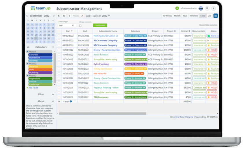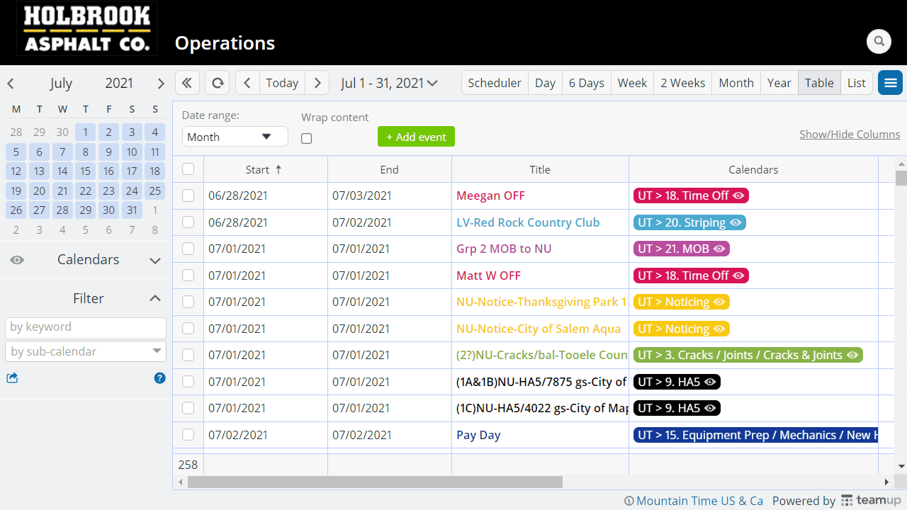With 11 calendar views, you’ll be able to work with information in new ways and gain insights you’ve been missing. Standard calendar views, from day to year, allow you to handle scheduling from short-term crisis control to long-term planning. Unique views allow you to work with data and manage operations in new and powerful ways. The Scheduler view shows, at a glance, open or filled time slots for a specific resource or crew. Timeline view is perfect for planning each project phase. Table view displays events like a spreadsheet, can be filtered and sorted, and automatically sums any custom number field.