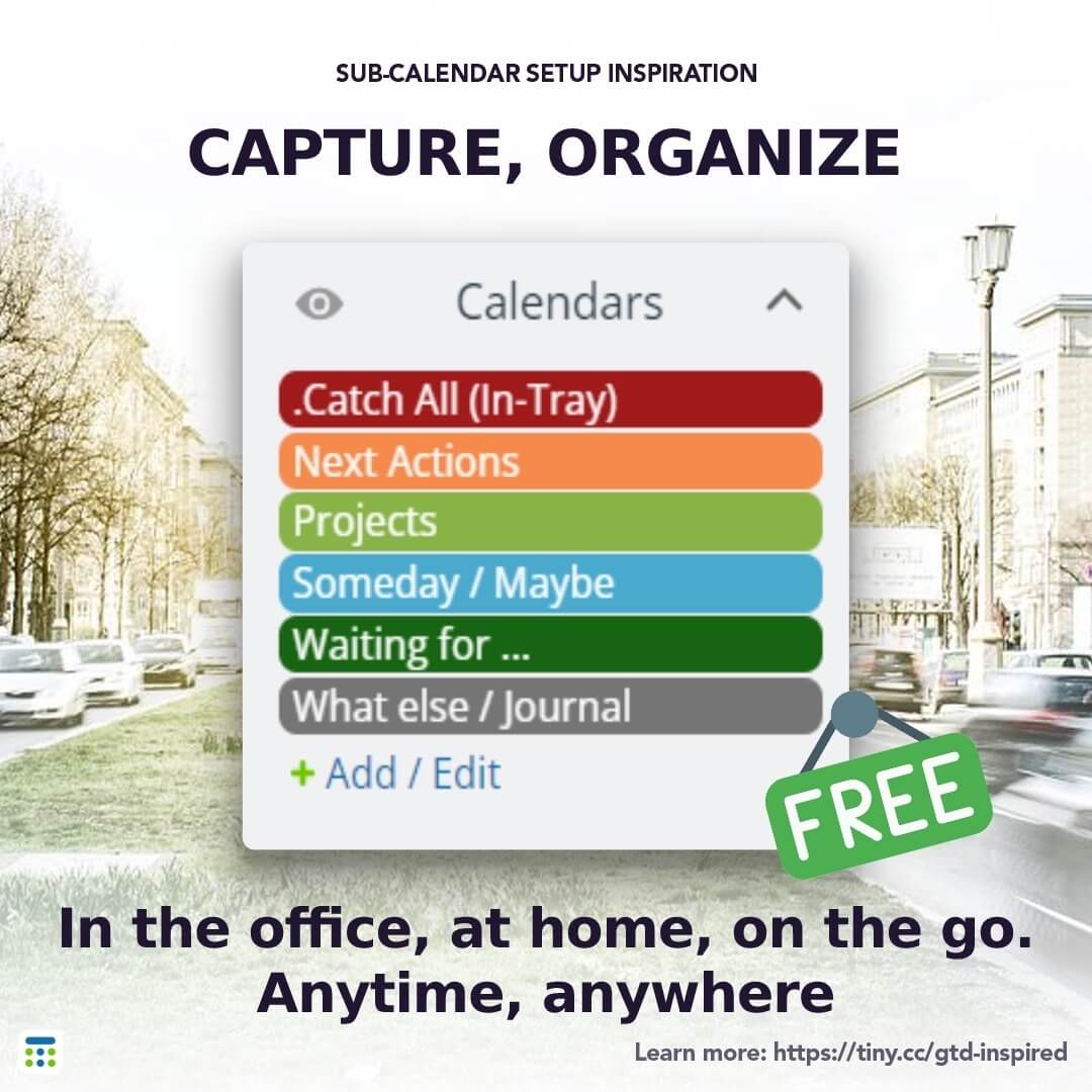 Too many things on your mind? Capture them in a reliable system and get organized. Do a digital mind sweep for better focus. Visualize next actions. Bring clarity to projects. Apply the Getting Things Done methodology and make it all work. Learn more.