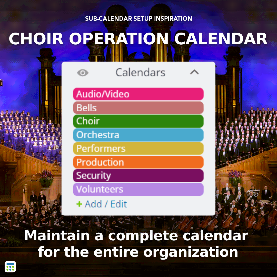 Managing all the calendars of different groups at a large choir operation is no small challenge. Teamup makes it easy to maintain a complete calendar for the entire organization. With granular access rights, it’s simple and secure to have individuals in the different groups responsible for updating their own schedules.