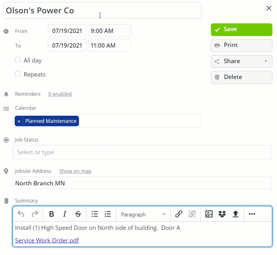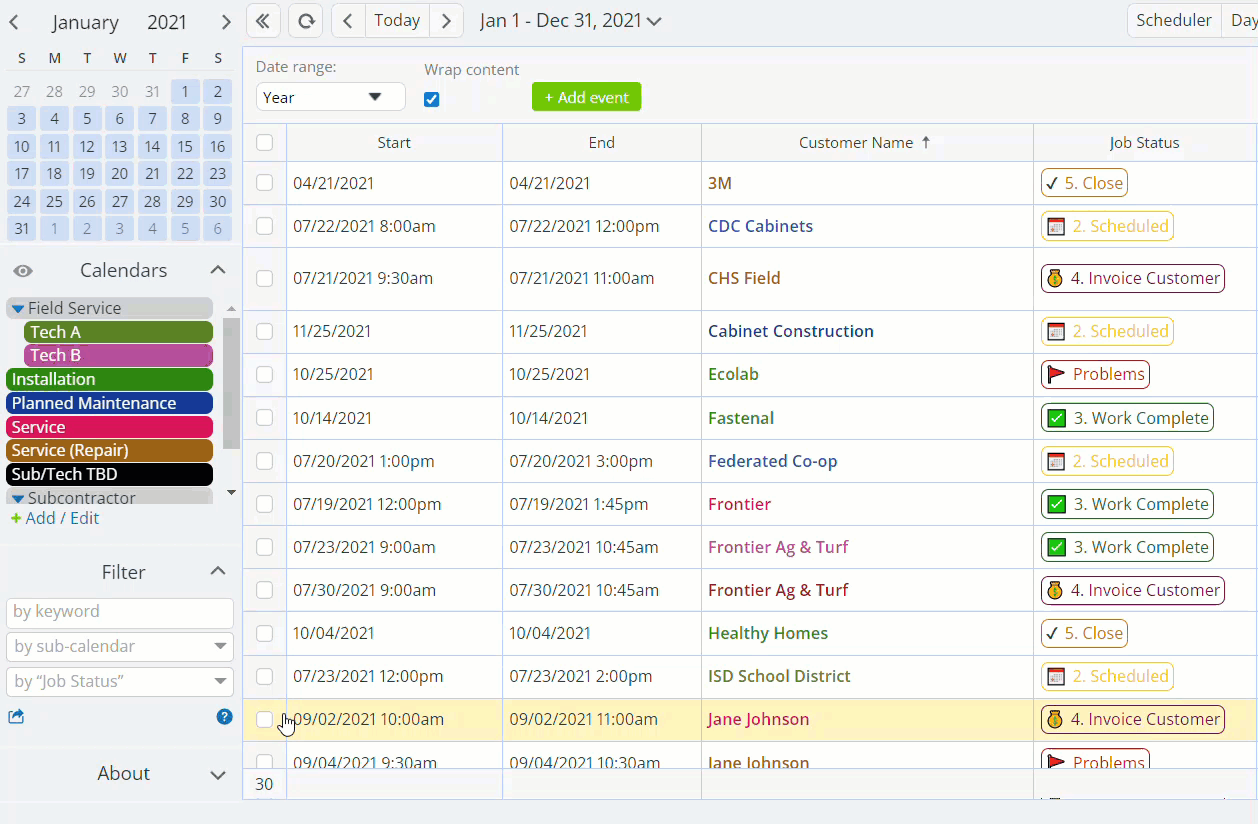 Use multiple custom fields to tag key contextual information in each event or job, such as client name, project name or ID, and status. Search or filter to find the info whenever needed.