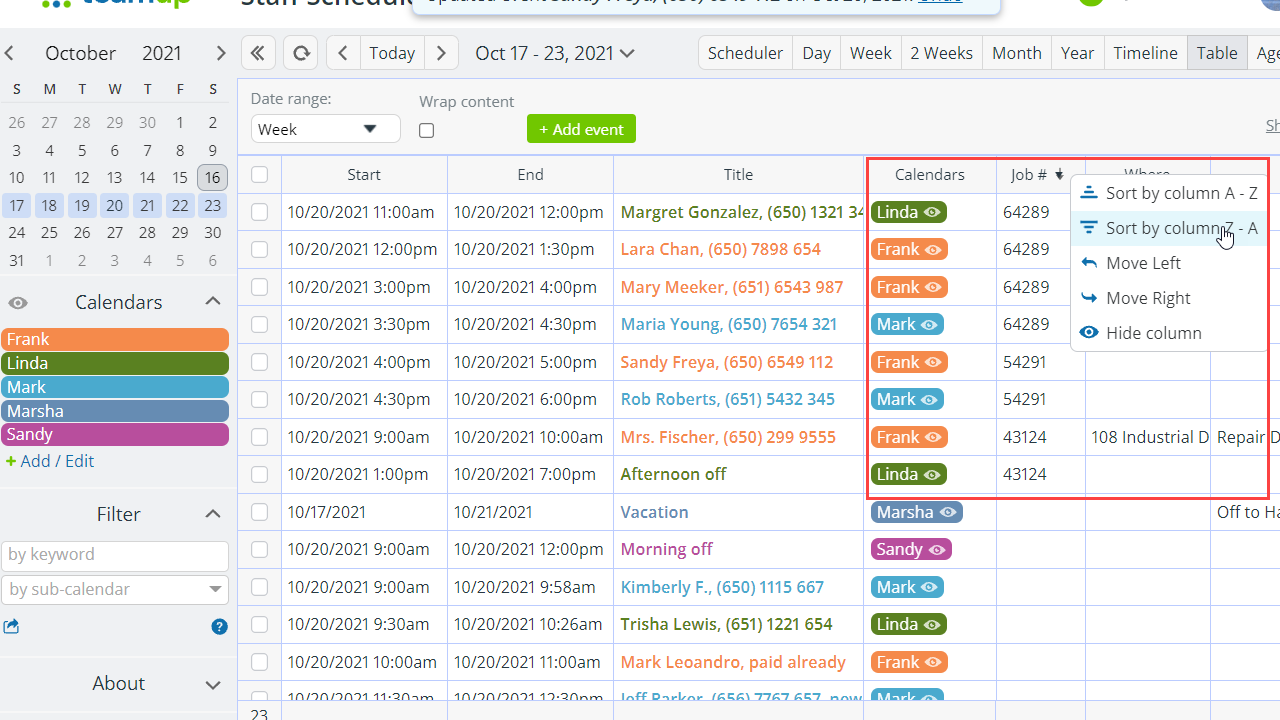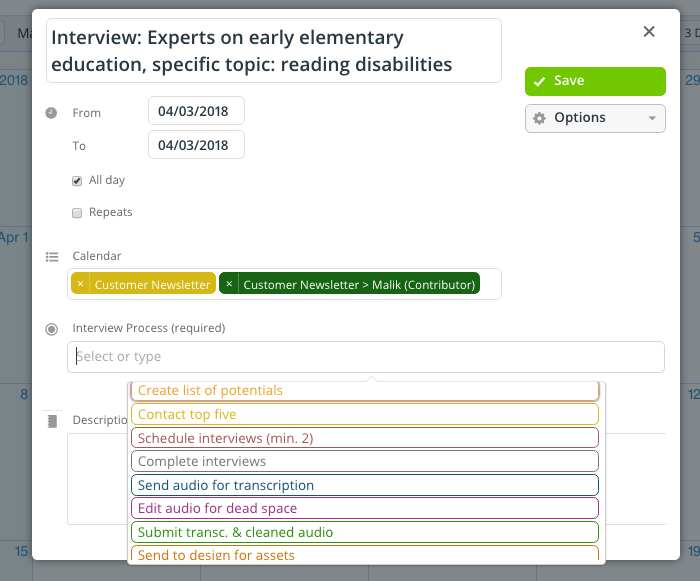 Teamup’s unique custom fields significantly extends the possibilities of getting organized far beyond a calendar app. Create custom fields with text entry or prefilled options in dropdown lists. Easily filter your entire calendar by keyword, tags, names, numbers, or options. Learn more.