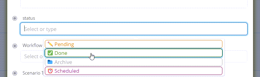 Create multiple choice options such as pending, review, done. Assign emojis for each status to make them easily visible and filterable on the calendar view.