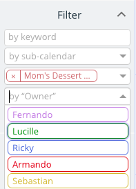 Filter all calendar events to show only a specific value in any custom choice field. For example, show only events with “Fernando” in the “Owner” field.