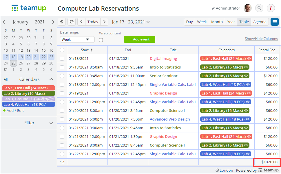 Numbers can be entered and displayed just like any other event fields in any calendar views. What’s unique is that in the Table view, the field is sortable and displays the sum in the bottom.