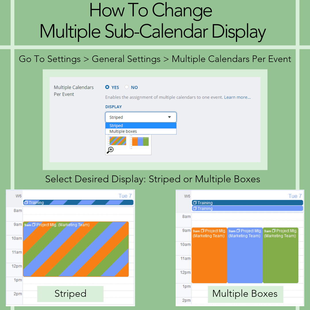 When you have an event assigned to multiple calendars, choose to display with stripes or boxes.