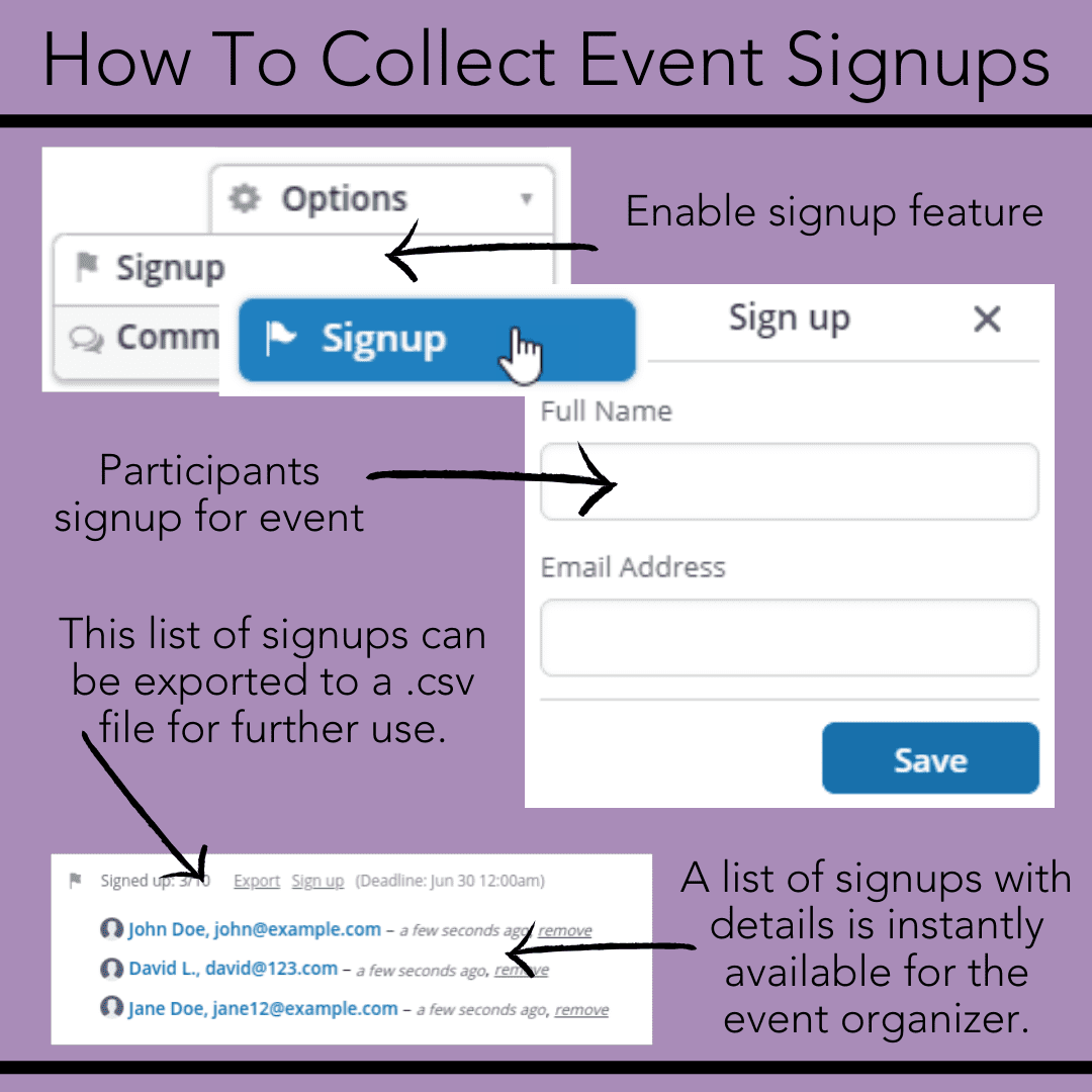 When participants need to sign up or register. Set maximum number and signup deadline.