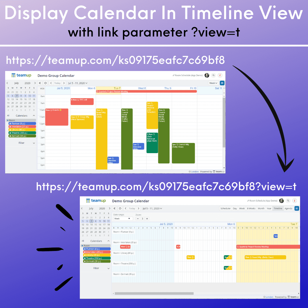 Append link parameter ?view=t to any calendar link to see it in the Timeline view