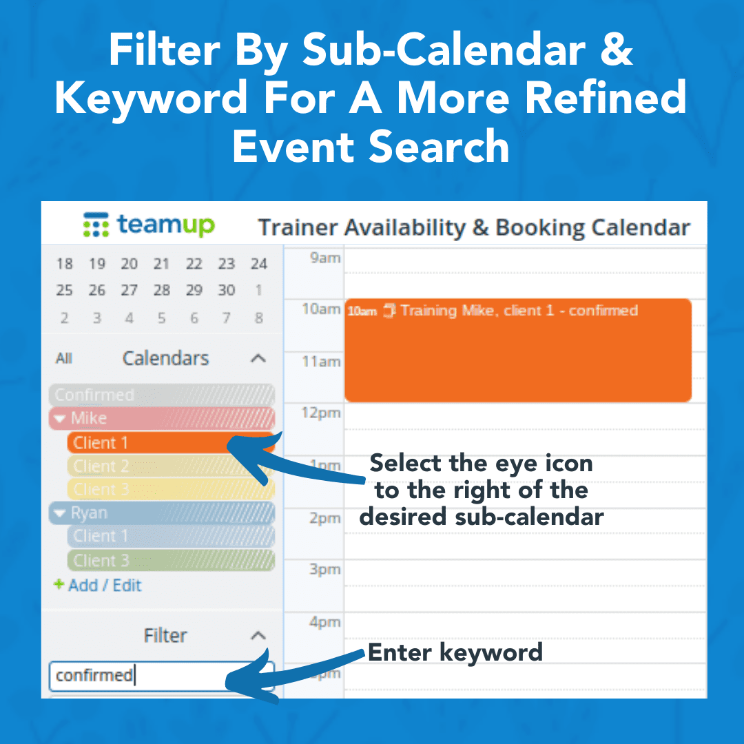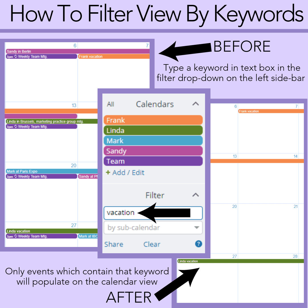 Filter calendar events by keyword or by multiple keywords to see only events with that keyword.