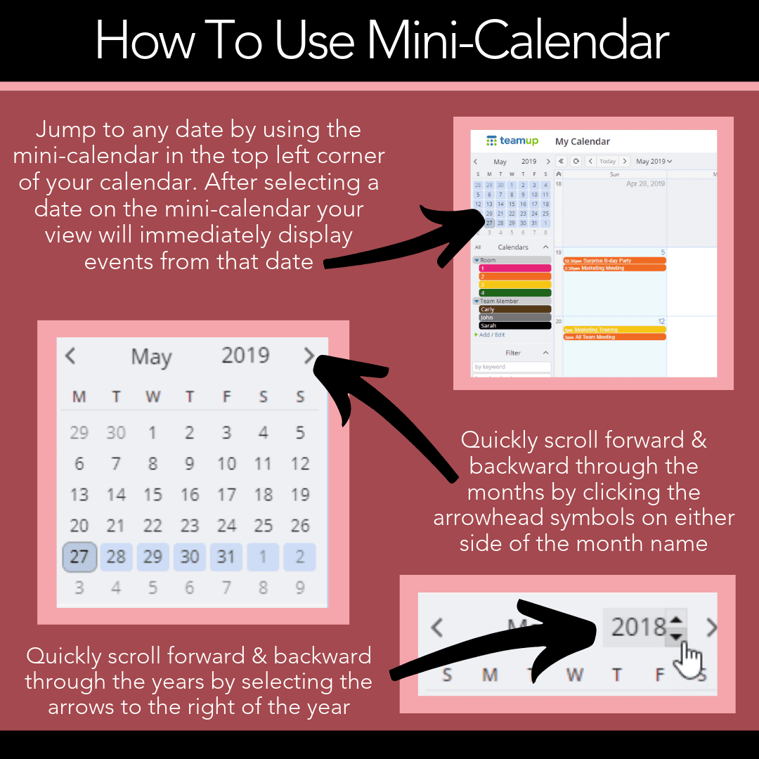 Quickly jump to the desired date by using the date picker or mini calendar in your Teamup menu.