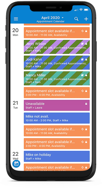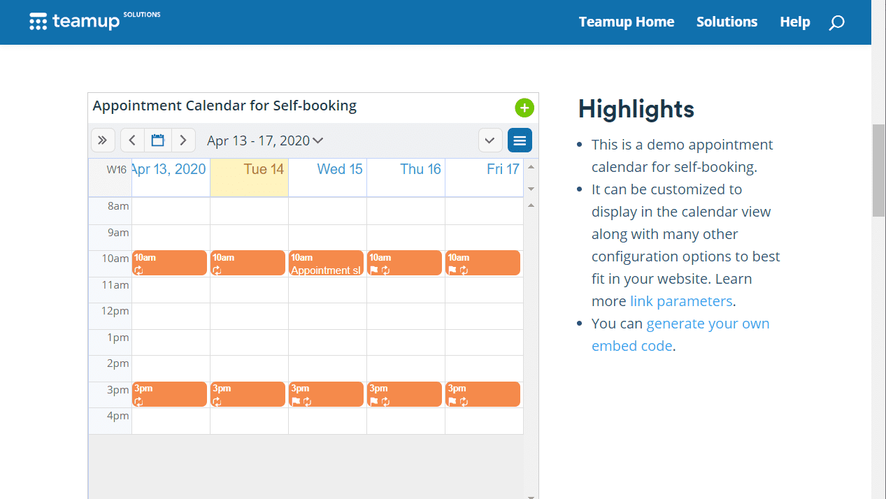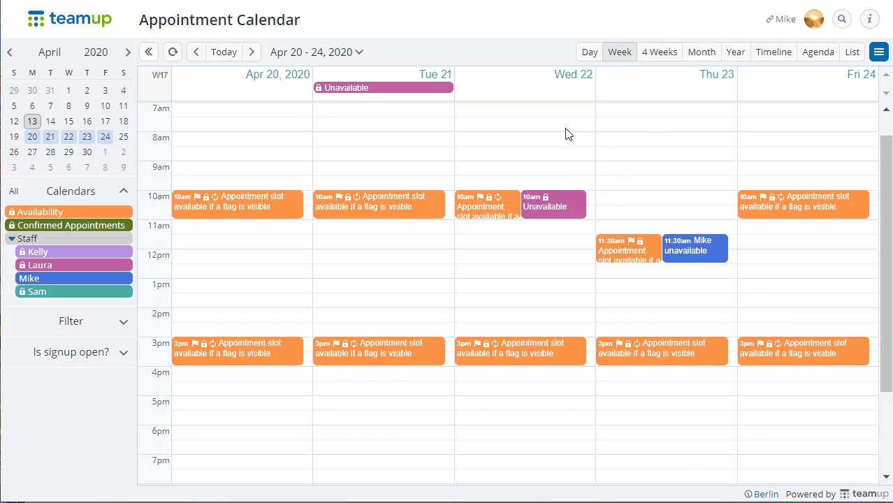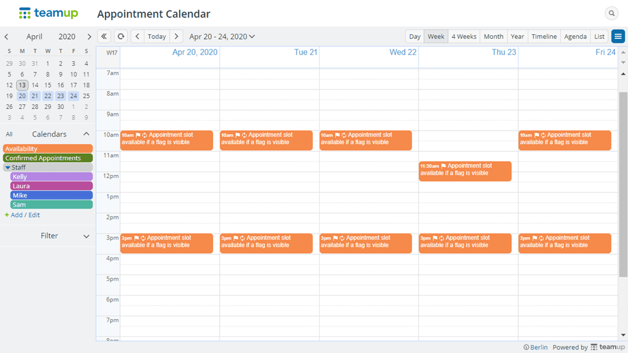 - Choose an appropriate calendar view as the default, e.g. the week view for hour specific appointment slots