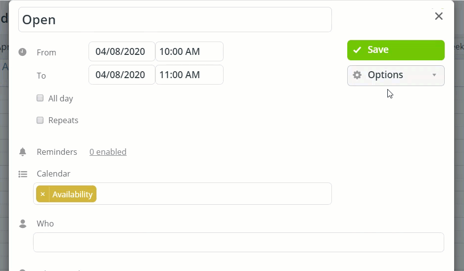 - Set appropriate calendar resolution so that a client may simply drag over the time he needs to create the event.