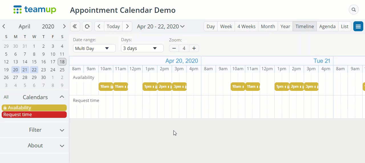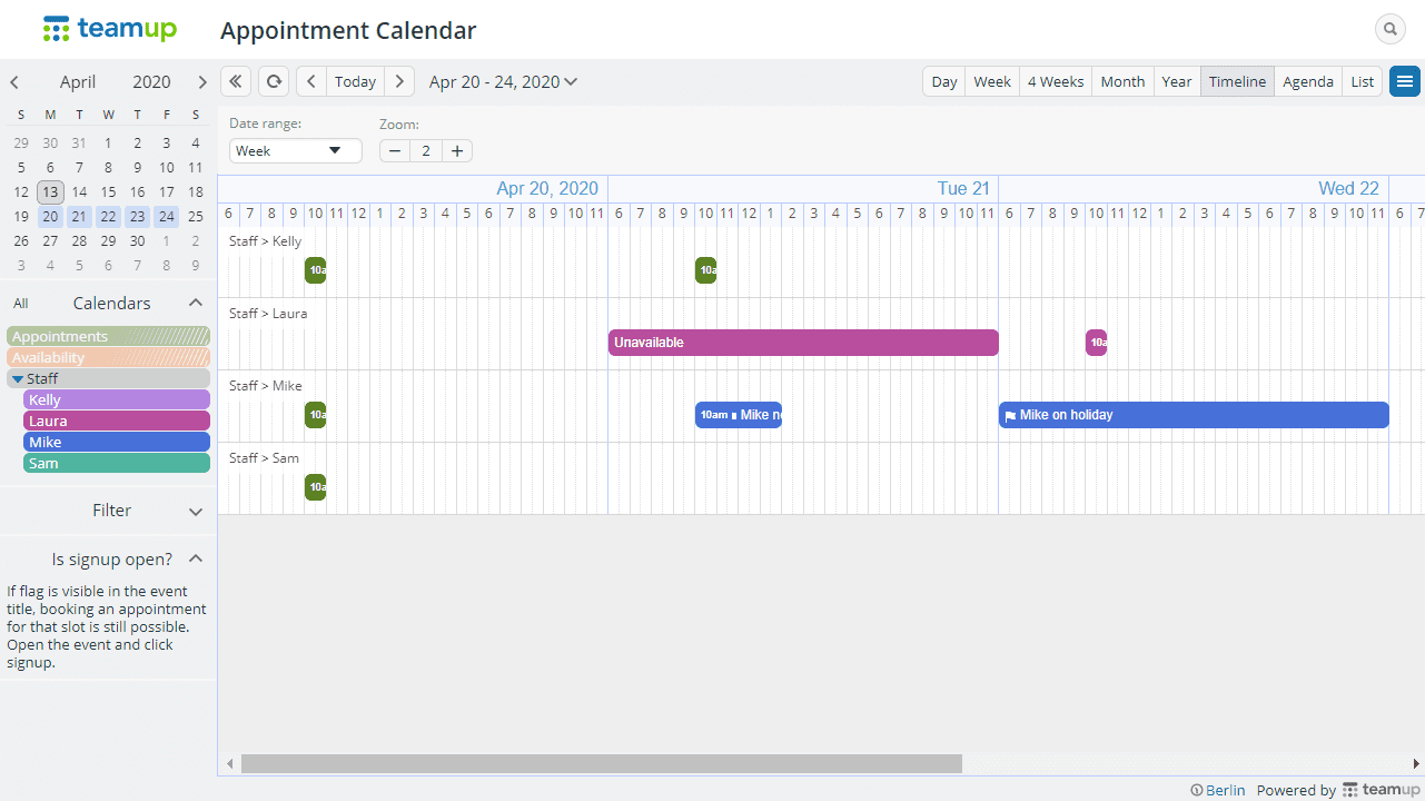 - To see who is available in a specific time slot, use the Timeline view.