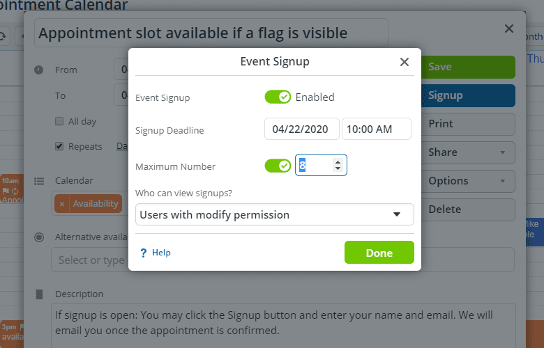- Select only “Users with modify permission” can view signups to keep the signup list private.