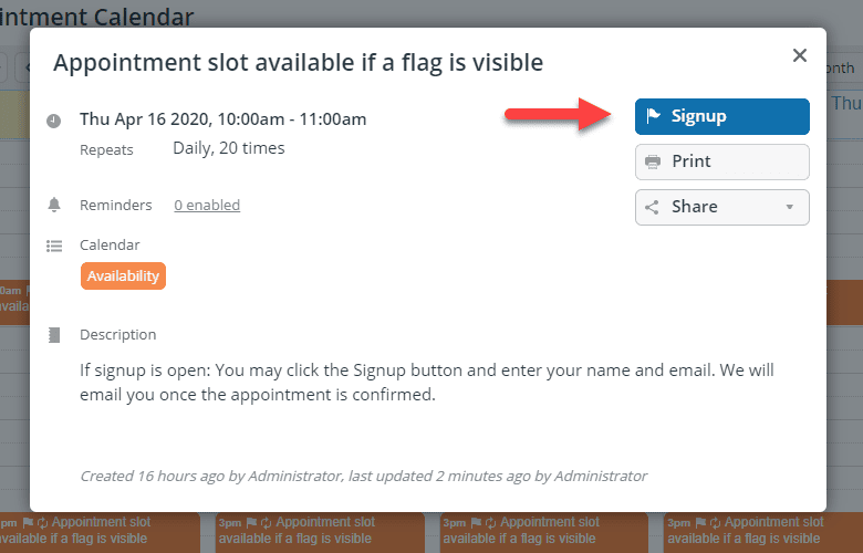 - Availability: pre-defined time slots available for signup (tip: consider when to use pre-defined slots vs. book any time with the add-only permission).