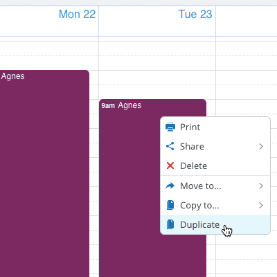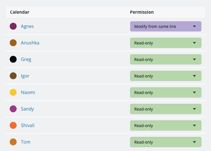 Agnes can view but not modify shifts assigned to her, and is able to add as well as modify her own events within her calendar link. Therefore, she can request holidays by creating an event with the vacation request sub-calendar, which will then be confirmed by the manager and assigned to the vacation confirmed sub-calendar.