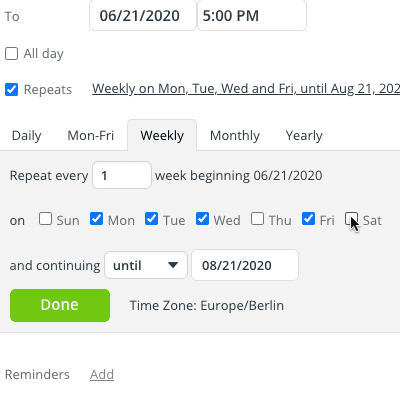 Choose from detailed options for recurring events on your calendar. Choose the repeating option (daily, weekly, and many more) and set the number of recurrences.