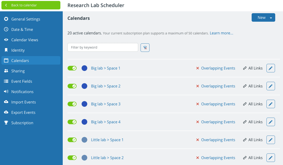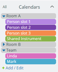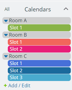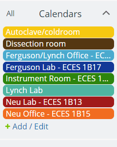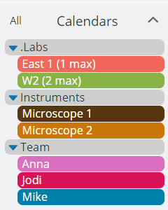 Collapsible folders can be set up for labs, floors, wings, etc. The appropriate dependent sub-calendars are nested within the folder.
