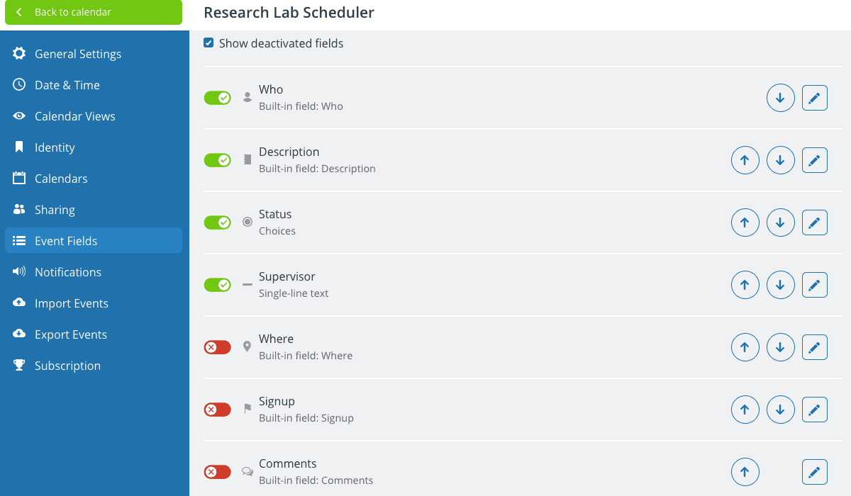 Event fields–such as Who and Where–are automatically part of each event. You can create and arrange your own custom event fields to capture the information you need. Choose from text entry or predetermined choice options.