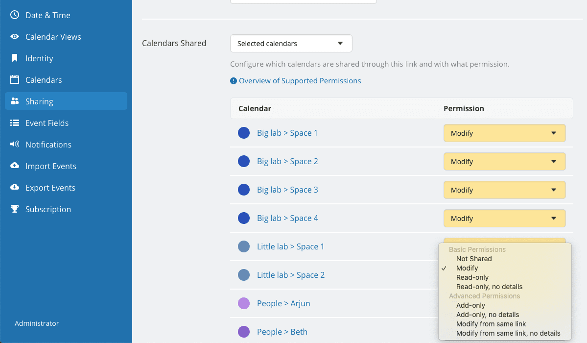 Option 2: For a simplified solution with just one link for all team members, the administrator can set up a link with either add-only or modify permission. Add-only means users can create new bookings but cannot modify anything, while the modify permission means everyone can add and edit any events on the calendar. The optimal access permission will depend on your unique scenario.