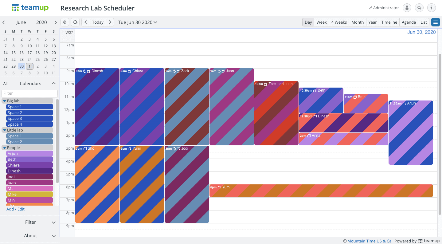 We just started using Teamup in our Diabetes and Metabolism Research Institute because we can no longer freely use all of the equipment, instruments, and services available in our building without first controlling traffic in our labs and specialty rooms. It is a terrific solution.