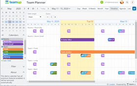 Please note: All live demo calendars are scheduled for deletion automatically. They are pre-configured to demonstrate various use cases. Feel free to reconfigure and test features but do not use them for your actual calendar. Create your own Teamup Calendar and check out the Getting Started Tutorials to learn more about what you can do.