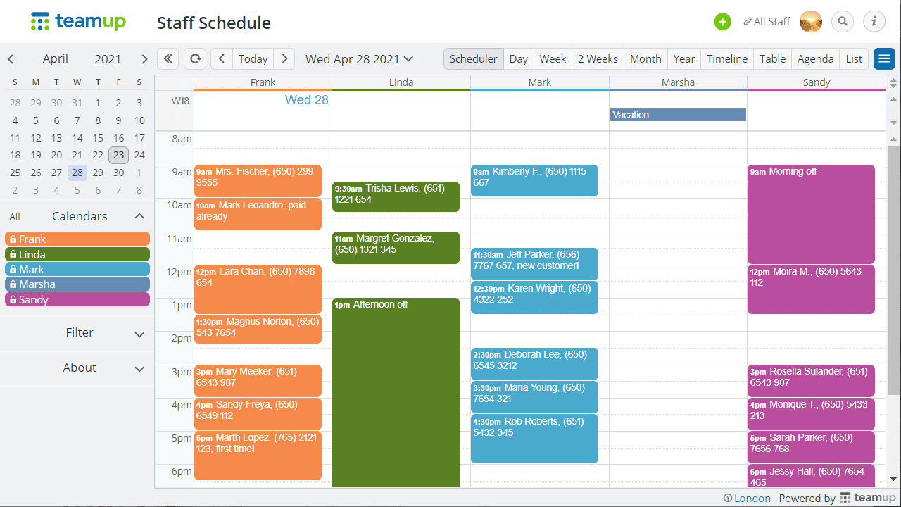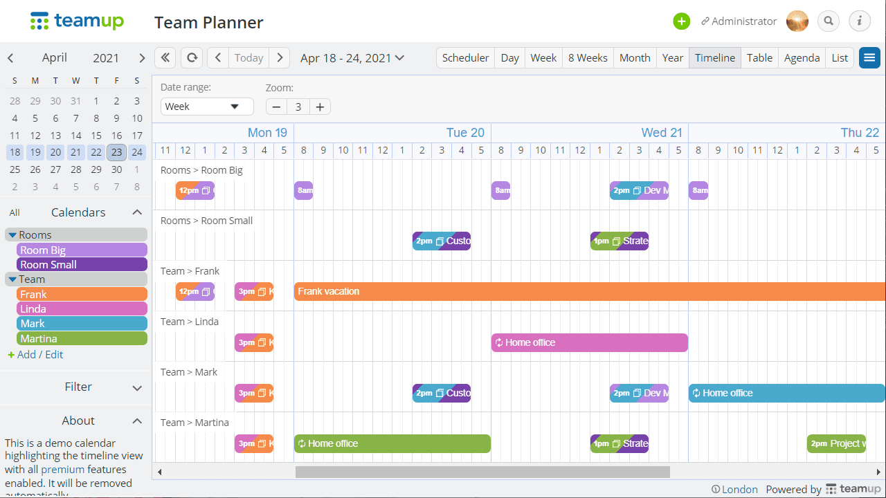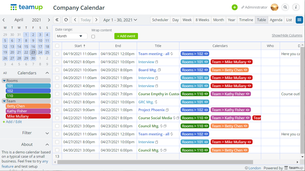 Teamup Calendar is much more than an ordinary calendar. It helps groups as well as individuals plan, organize, access and share information more efficiently. Whether you need to organize teams, schedule work, manage resource availability, or plan events and share information, Teamup makes it easy for you to create the calendar solution you need. It’s simple, highly customizable, and scalable.